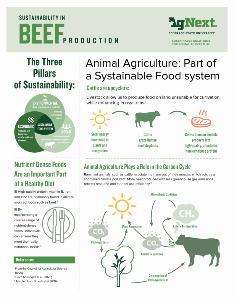 The expert team at AgNext at Colorado State University have worked to develop this Beef Sustainability Fact Sheet to summarize and provide a clear understanding of the relationship between beef production and sustainability. This fact sheet discusses the three pillars of sustainability broadly and explains how each of the pillars plays a critical role in a sustainable system. Additionally, the document visualizes the role of cattle in promoting a healthy food system and underscores the importance of beef as part of a healthy diet. This fact sheet utilizes data from the Intergovernmental Panel on Climate Change (IPCC) to demonstrate that animal agriculture contributes less than five percent of total greenhouse gas emissions in the United States, with enteric methane, a byproduct of cattle production, being the primary contributor.